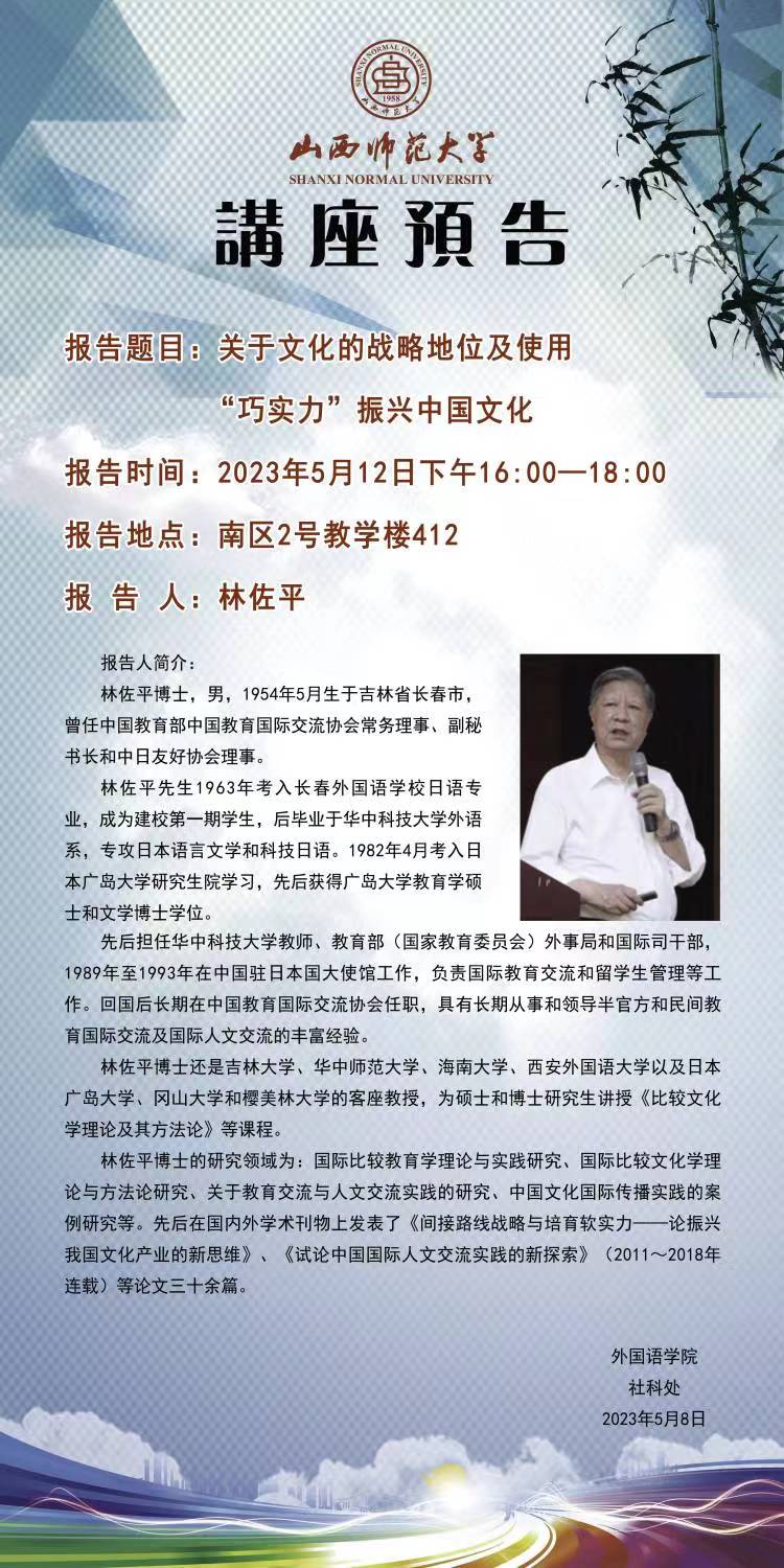 【预告】中国教育国际交流协会原常务理事林佐平博士应外国语学院邀请来永利官网作学术报告