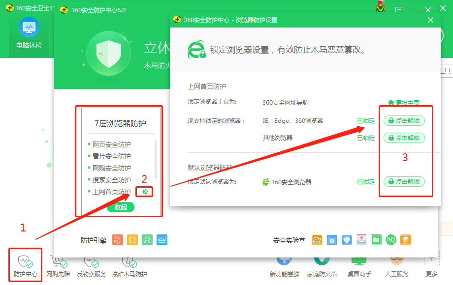 打开360安全卫士 → 防护中心→ 7层浏览器防护→ 上网首页防护→ 点击设置按钮→ 点击解锁。