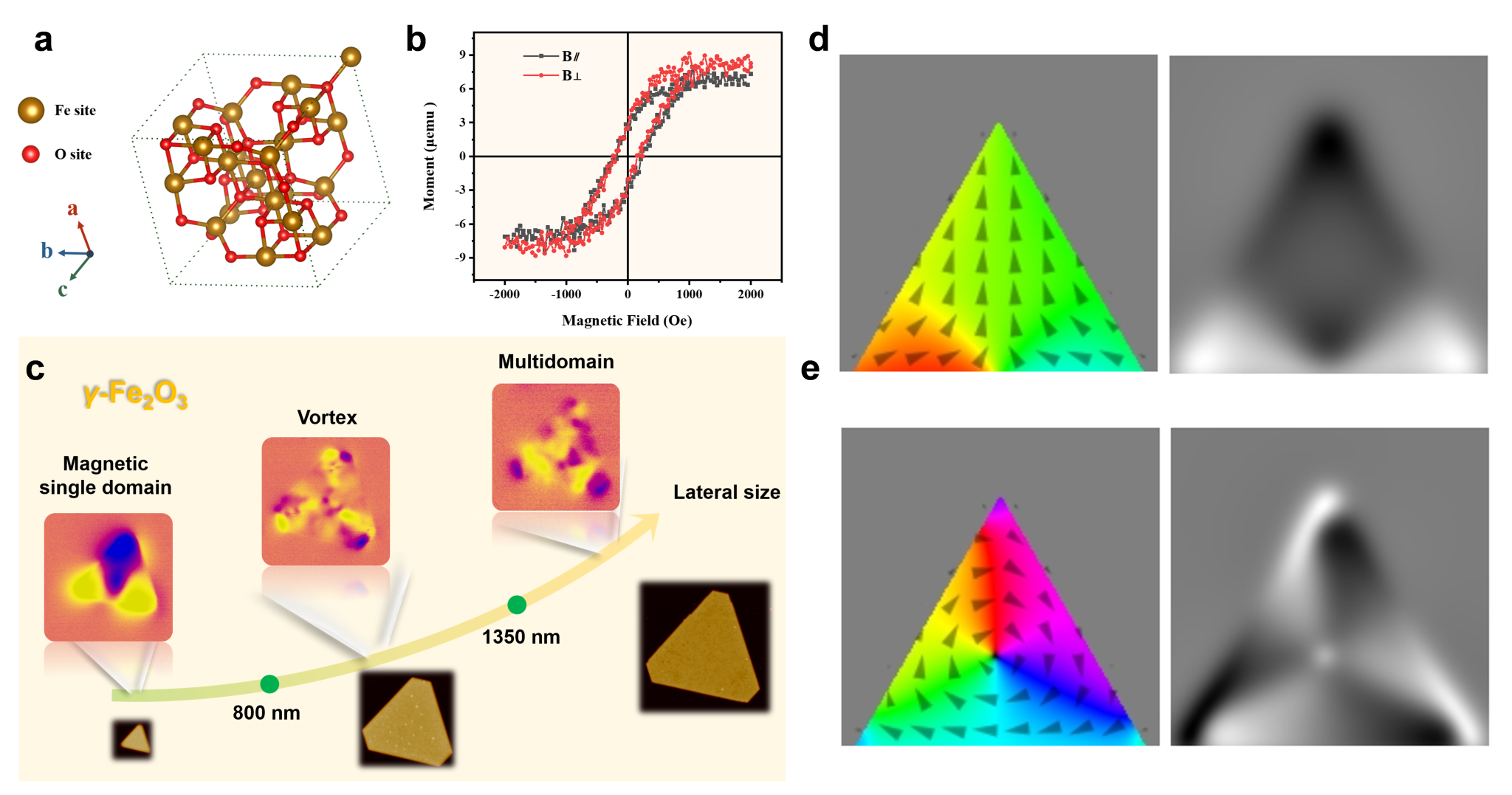 图2 (a)立方反尖晶石γ-Fe2O3的晶体结构; 二维γ-Fe2O3的(b)室温磁滞回线, (c)磁畴随横向尺寸增大的演化过程; (d,e)微磁学模拟的单畴态和涡旋态磁化矢量分布图与磁相图。