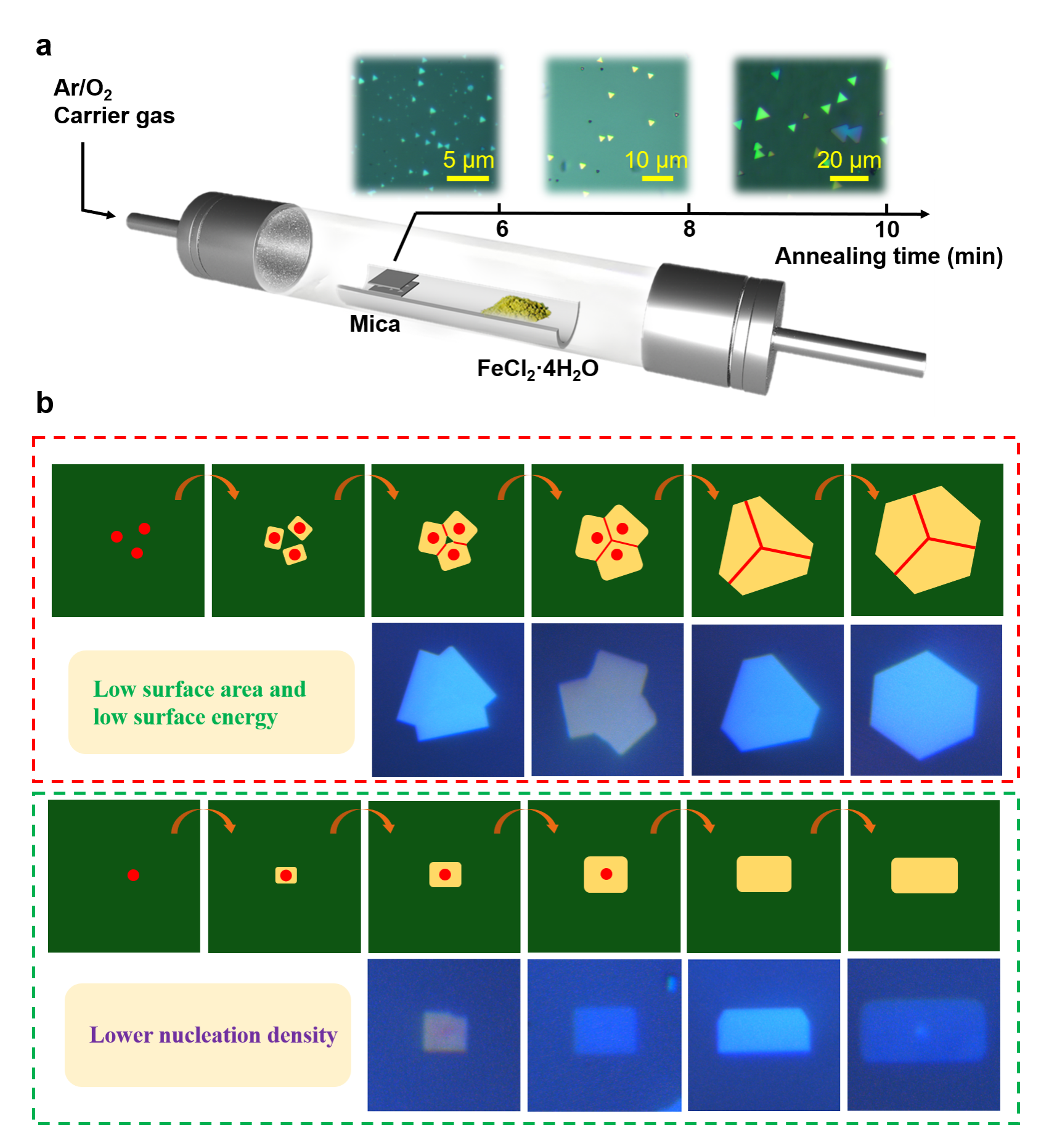 图1 (a)通过精确控制退火时间获得一系列不同横向尺寸的二维γ-Fe2O3; (b)ε-Fe2O3矩形单晶纳米片和六边形多晶纳米片的生长过程图示。