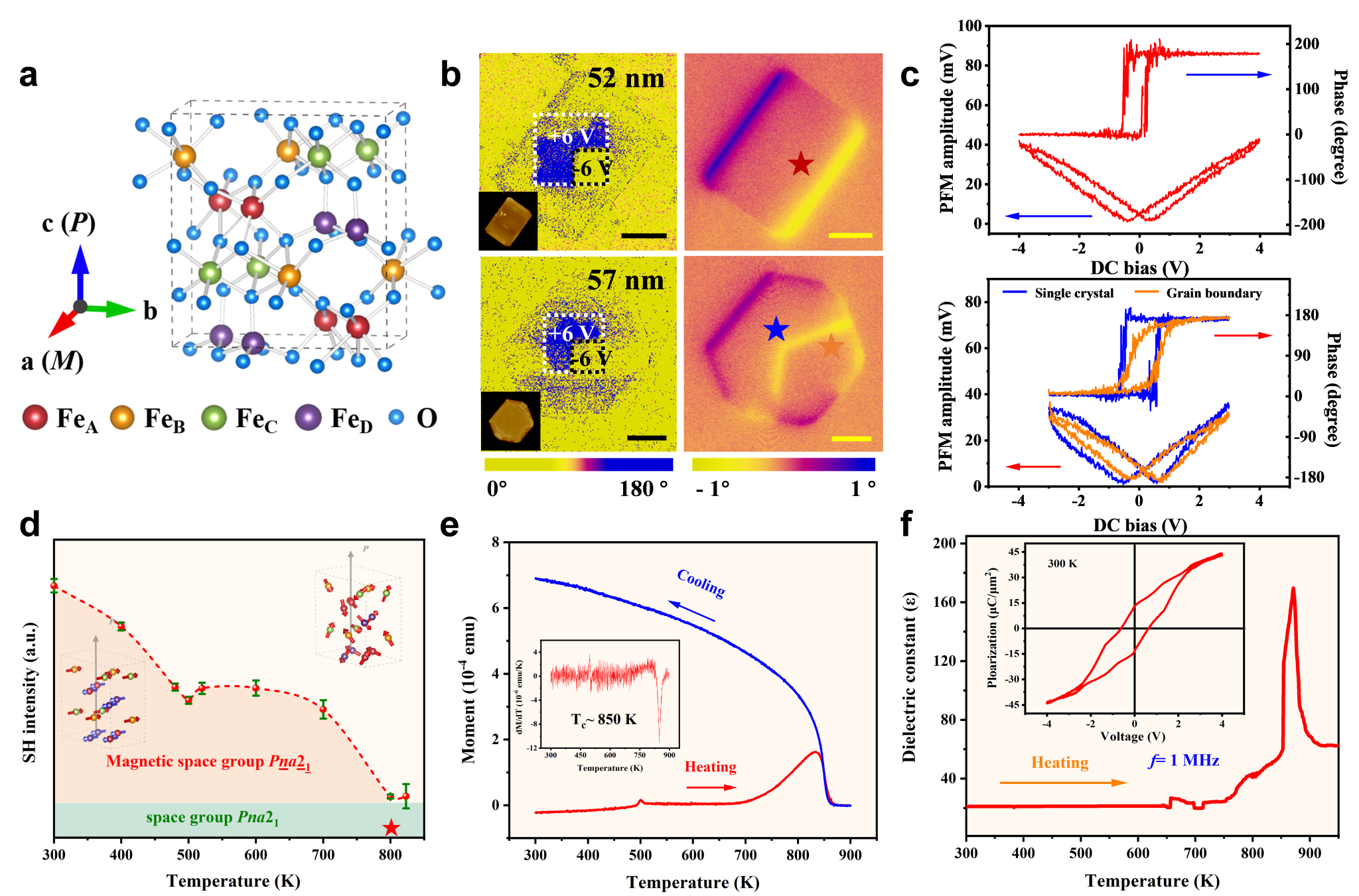 图3 (a)ε-Fe2O3的晶体结构; (b)ε-Fe2O3矩形单晶和六边形多晶纳米片的铁电畴反转; (c)在(b)中星形标识处的相位回滞曲线和振幅蝴蝶曲线; 样品的(d)高温二次谐波信号, (e)磁化强度随温度变化的演化曲线(插图为磁化强度对温度的一阶导数)和(f)高温介电谱图(插图为室温电滞回线)。