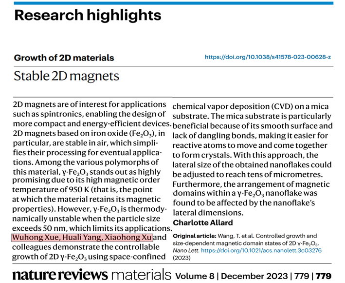 研究成果以“Controlled Growth and Size-Dependent Magnetic Domain States of 2D γ-Fe2O3”为题发表在著名学术期刊《纳米快报》上 (Nano Lett. 2023, 23, 10498−10504)。随后,材料科学权威期刊自然评论材料《Nature Reviews Materials》副主编Charlotte Allard以“Stable 2D magnets”为题对该项工作进行了整版的“研究亮点”(Research Highlights)专题报道(Nat. Rev. Mater., 2023, 8, 779)。