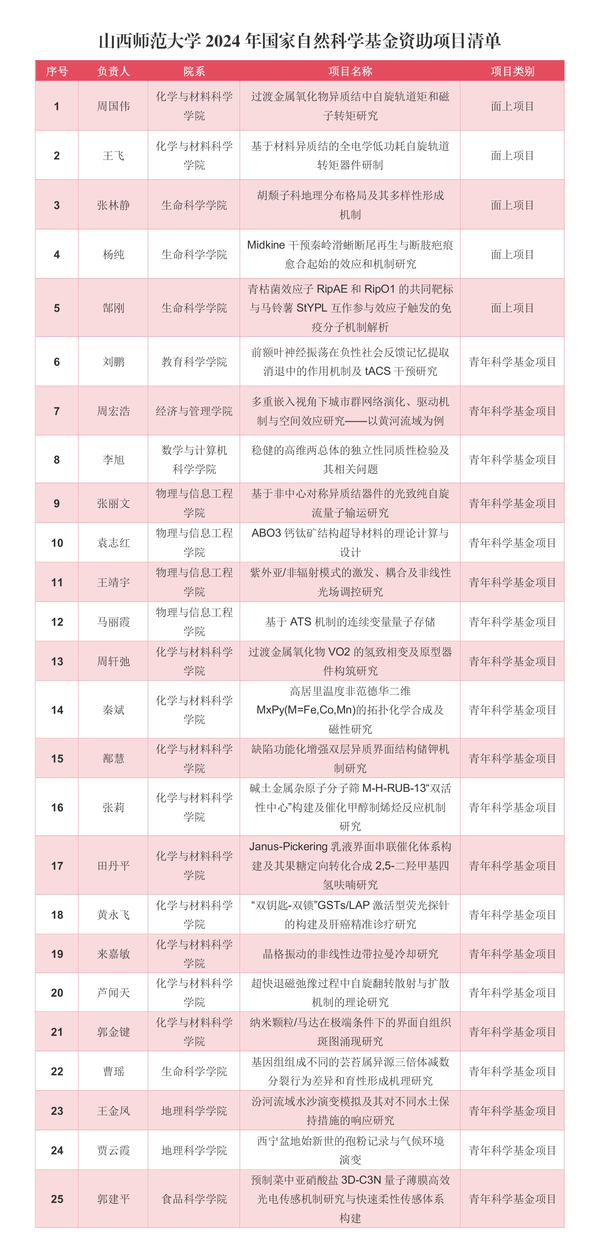8月23日,国家自然科学基金委公布了2024年度集中受理期部分项目评审结果,永利官网获资助项目数和总经费数创历史新高,获批资助项目25项,直接经费846万元,包括面上项目5项、青年项目20项(见附表)。(来源:科技部)