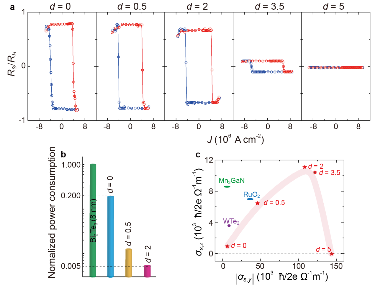 图2 PtTe2(d)/WTe2(8-d)/NiO (25 nm)/铁磁层中垂直磁化铁磁层的全电学低功耗操控和高自旋霍尔电导率