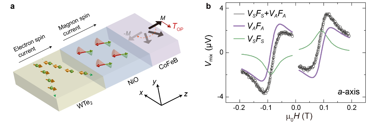 论文的研究内容主要集中在通过设计晶体对称性破缺的WTe2/反铁磁绝缘体NiO/铁磁体异质结,首次观察到面外方向的反阻尼磁振子转矩(图1)。此外,研究还发现,具有面外极化的磁振子流可以穿透25纳米厚的多晶NiO层,并保持其原始自旋极化方向不变。最后,通过引入具有高自旋霍尔电导率的PtTe2层,该团队在PtTe2/WTe2/NiO/CoFeB异质结中实现了垂直磁化铁磁层CoFeB的全电学、低功耗操控(图2)。这些发现不仅在基础科学研究领域具有重要意义,还为未来开发高效磁性存储器件和自旋电子器件提供了新的理论和实验基础。(来源:科技部 化学与材料科学学院)