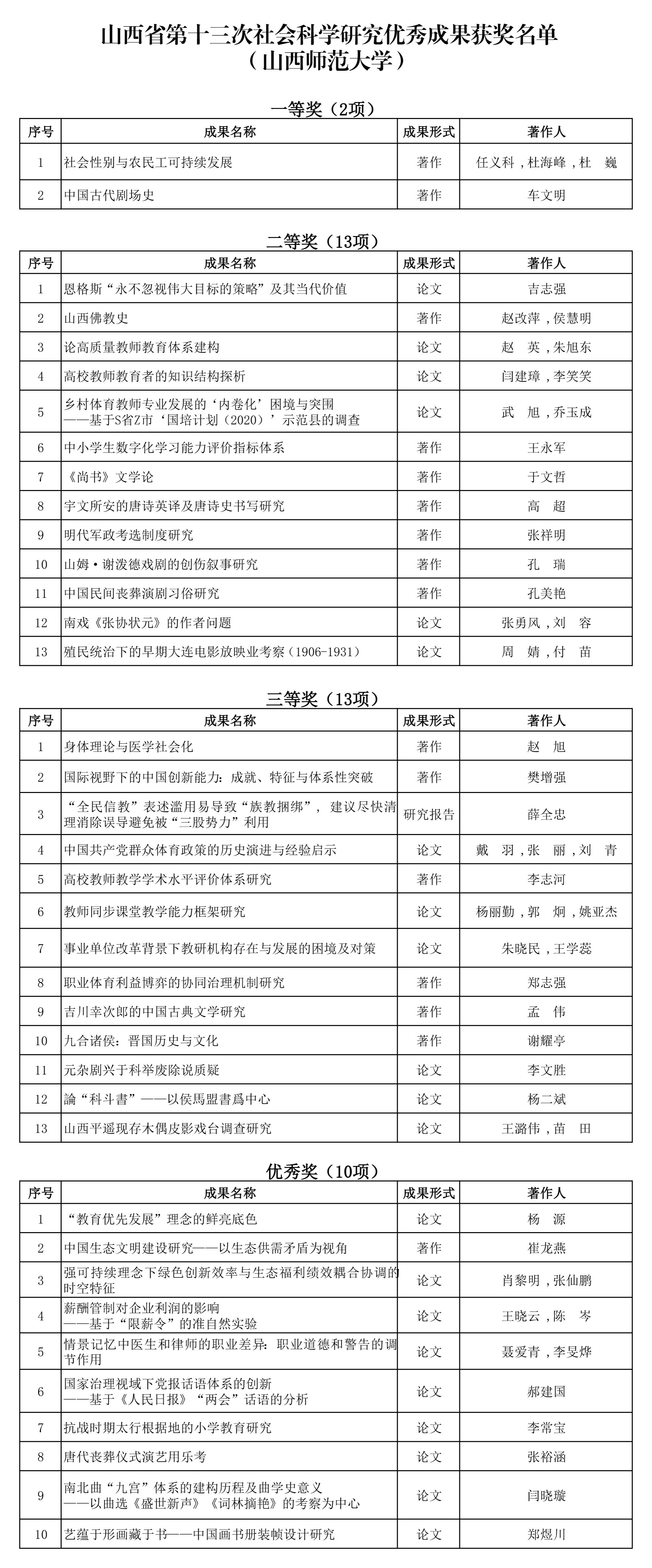 山西省社会科学研究优秀成果奖是省委省政府领导,省社科联具体组织承办的全省社会科学最高奖励,每两年举办一次,旨在推动山西省哲学社会科学的繁荣发展。本次评奖共评出优秀成果284项,其中一等奖25项、二等奖70项、三等奖94项、优秀奖95项,另评出优秀组织奖11项。(来源:社科部)