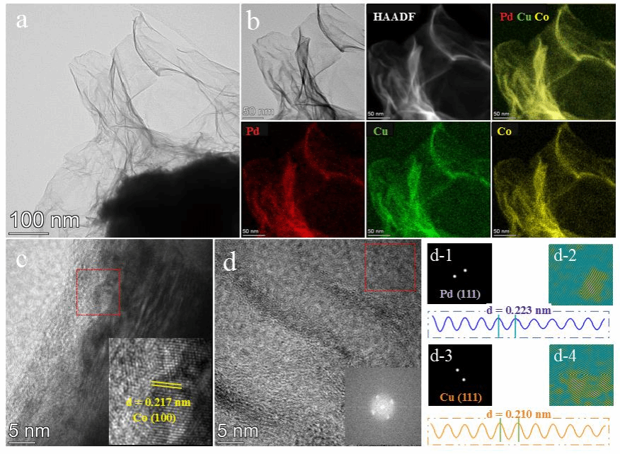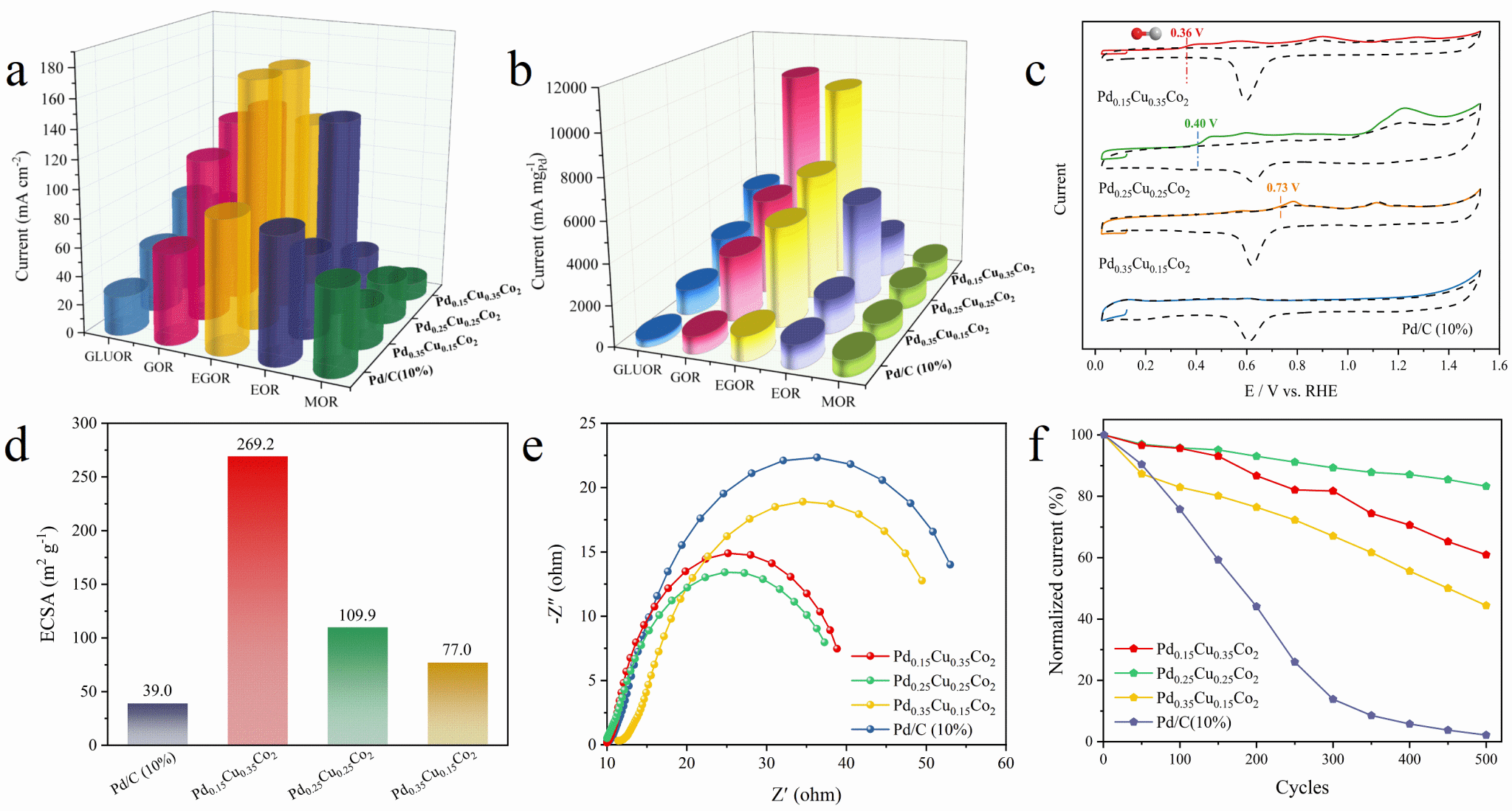 实验结果表明,该催化剂在碱性电解质中表现出卓越的电催化性能。其中,Pd₀.₁₅Cu₀.₃₅Co₂催化剂对乙二醇和甘油的氧化电流密度分别达到9.7和10.9 A mg⁻¹,远超目前报道的大多数电催化剂。此外,该催化剂还展现出优异的抗CO中毒能力和长期稳定性,远优于传统Pd/C催化剂。通过多种表征手段深入分析了催化剂的反应机理,结果表明,Pd、Cu和Co之间的协同作用不仅优化了催化剂表面的电子结构,还促进了含氧物种的吸附和反应中间产物的脱附,从而显著提升了催化活性和选择性。这一发现为设计和开发高效、稳定的电催化剂提供了新的思路。(来源:科技部)